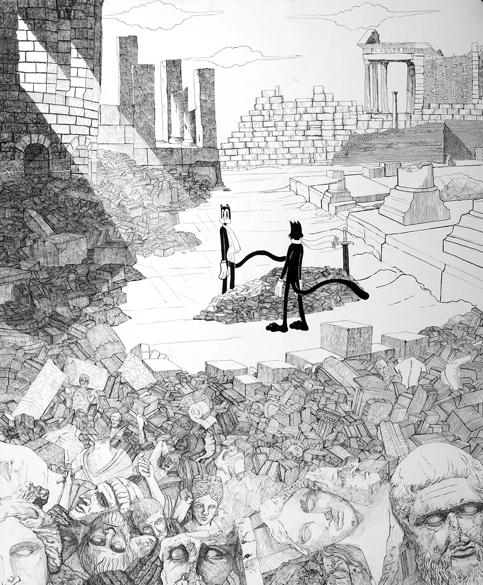 These drawings are water soluble, it is the act signing my name over and over again with something that can be spit on and washed away. The binary quality of pen and ink, black and white is simple, but the hatching and shading can be as complex as time, imagination and effort allow. The visual, two dimensional history of Art becomes pastiche, Scrawling ersatz cartoons on the lovingly (but not faithfully) rendered walls of the Parthenon or the ruins of Roman Africa. Using the influences of the visual language and technique of modern comics, 16th century Flemish allegorical drawings and the forced, flattened perspective of 18th century japanese woodblock in an attempt to form an emotional narrative, partially obscured, almost submerged by the baroque excess of it’s own over-rendering.