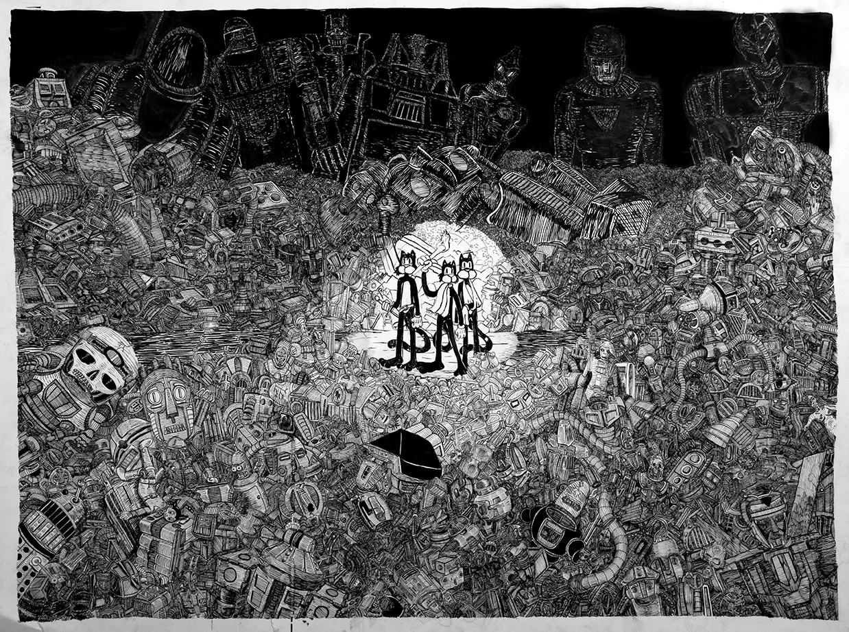 I’ll Meet You at the Corner of Godzilla and Mecha-Godzilla in Ten Thousand Years. 38" x 50" pen and ink